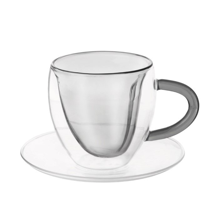 Dvoustěnný hrnek s podšálkem DOUBLE srdce 0,2 l, šedý, sada 2ks